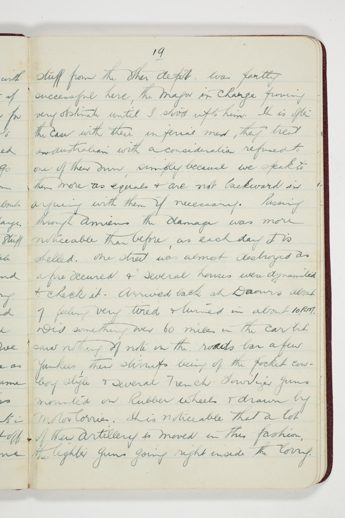 Passing through Amiens the damage was more noticeable than before, as each day it is shelled. One street was almost destroyed as a fire occurred & several houses were dynamited to check it. Arrived back at Daours about 7 feeling very tired & turned in about 10 P.M. Did something over 60 miles in the car but saw nothing of note on the roads bar a few Yankees, their stirrups being of the pocket cowboy style & several French Howitzer guns mounted on Rubber wheels drawn by motor lorries. It is noticeable that a lot of their artillery is moved in this fashion, the lighter guns going right inside the lorry.
