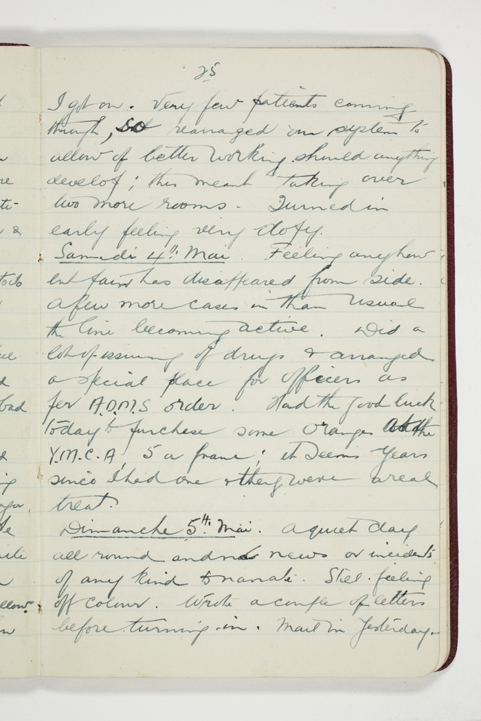 Feeling anyhow but pain has disappeared from side. A few more cases in than usual the line becoming active. Did a lot of issuing of drugs & arranged a special place for officers as per A.D.M.S. order. Had the good luck today to purchase some oranges at the Y.M.C.A. 5 a franc; it seems years since I had one & they were a real treat.