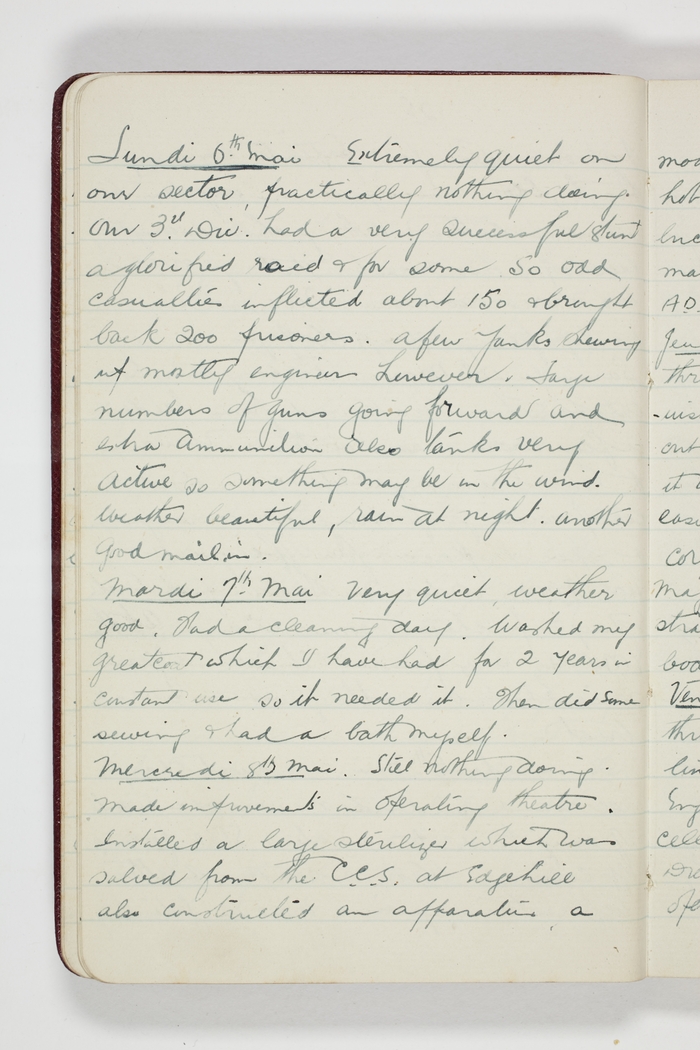 Extremely quiet on our sector, practically nothing doing. Our 3rd Div. had a very successful stunt a glorified raid & for some 50 odd casualties inflicted about 150 & brought back 200 prisoners. A few Yanks showing up mostly engineers however. Large number of guns going forward and extra ammunition also tanks very active so something may be in the wind. Weather beautiful, rain at night. Another good mail in.