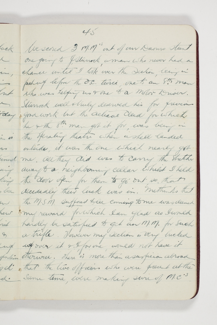 We scored 3 M.Ms out of our Daours stunt one going to J Sturrock, a man who never had a chance until I took over the section, being in fact up before the O.C. twice, one to an 8th man who was helping us & one to a Motor Driver. Sturrock well & truly deserved his for previous good work but the actual deed for which he & the 8th man got it for, was being in the operating theatre when a shell landed outside, it was the one which nearly got me. All they did was to carry the stretcher away to a neighbouring cellar whilst I held the door open for them to go out, so, that decidedly their luck was in. Methinks that the M.S.M. supposed to be coming to me was deemed my reward for which I am glad as I would hardly be satisfied to get an M.M. for such a trifle. However my section is very bucked up over it & I, for one, would not have it otherwise. There is more than a suspicion abroad that the two officers who were present at the same time, were making sure of M.Cs