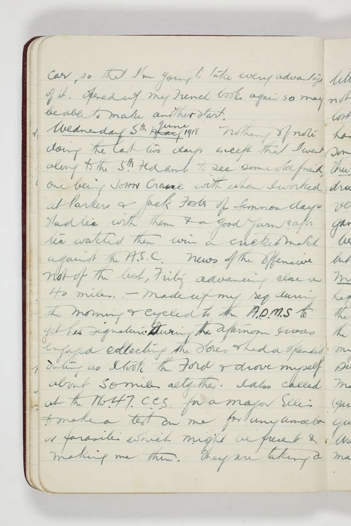 News of the offensive not of the best, Fritz advancing close on 40 miles. - Made up my req during the morning & cycled to the A.D.M.S. to get his signature. During the afternoon I was engaged collecting the stores & had a splendid outing as I took the Ford & drove myself about 50 miles altogether. I also called at the No. 47 C.C.S. for a Major Ellis to make a test on me for any amoeba or parasites which might be present & making me thin. They are taking a
