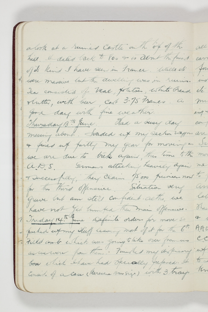 a look at a ruined castle on the top of the hill. It dated back to 800 & is about the finest of its kind I have seen in France. Walls etc were massive but the dwelling was in ruins. Tea consisted of Veal, potatoes, white bread & butter, with beer, cost 3.75 Francs. A good day with fine weather.