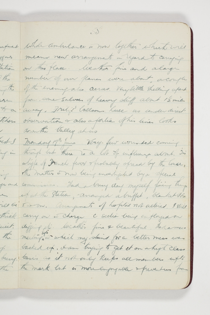 whole ambulance is now together which will mean new arrangements in regard to carrying on this place. Weather fine and a large number of our planes were about, a couple of the enemy also across. Very little shelling apart from some salvoes of heavy stuff about 1½ miles away. Fritz's balloons have us under direct observation & also a portion of his lines looks down the valley at us