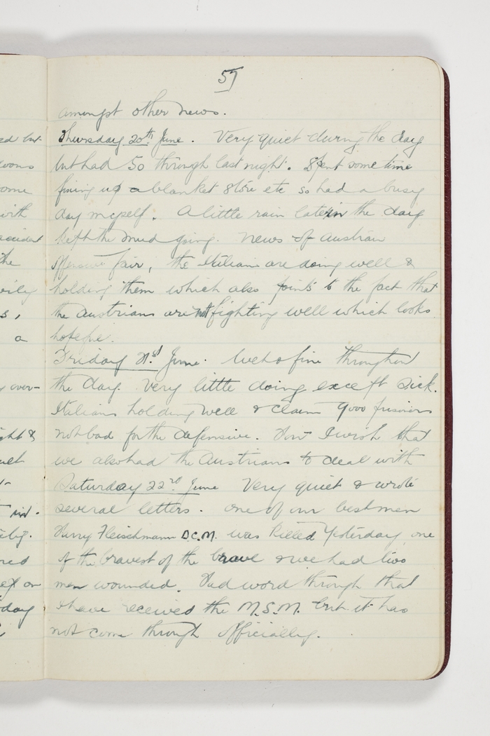 Very quiet & wrote several letters. One of our best men Harry Fleischmann D.C.M. was killed yesterday, one of the bravest of the brave & we had two men wounded. Had word through that I have received the M.S.M. but it has not come through officially.