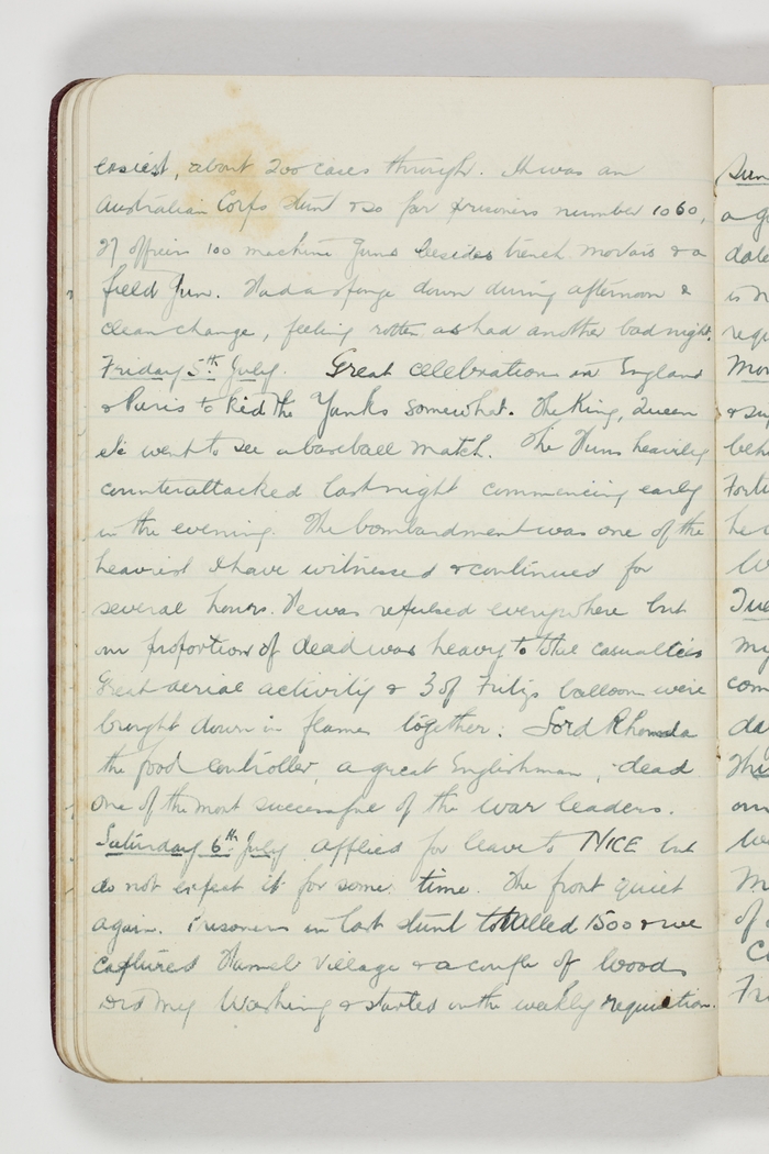 Great celebrations in England & Paris to kid the Yanks somewhat. The King, Queen etc went to see a baseball match. The Huns heavily counterattacked last night commencing early in the evening. The bombardment was one of the heaviest I have witnessed & continued for several hours. He was repulsed everywhere but our proportion of dead was heavy to total casualties Great aerial activity & 3 of Fritz's balloons were brought down in flames together. Lord Rhonda the food controller, a great Englishman, dead, one of the most successful of the war leaders.