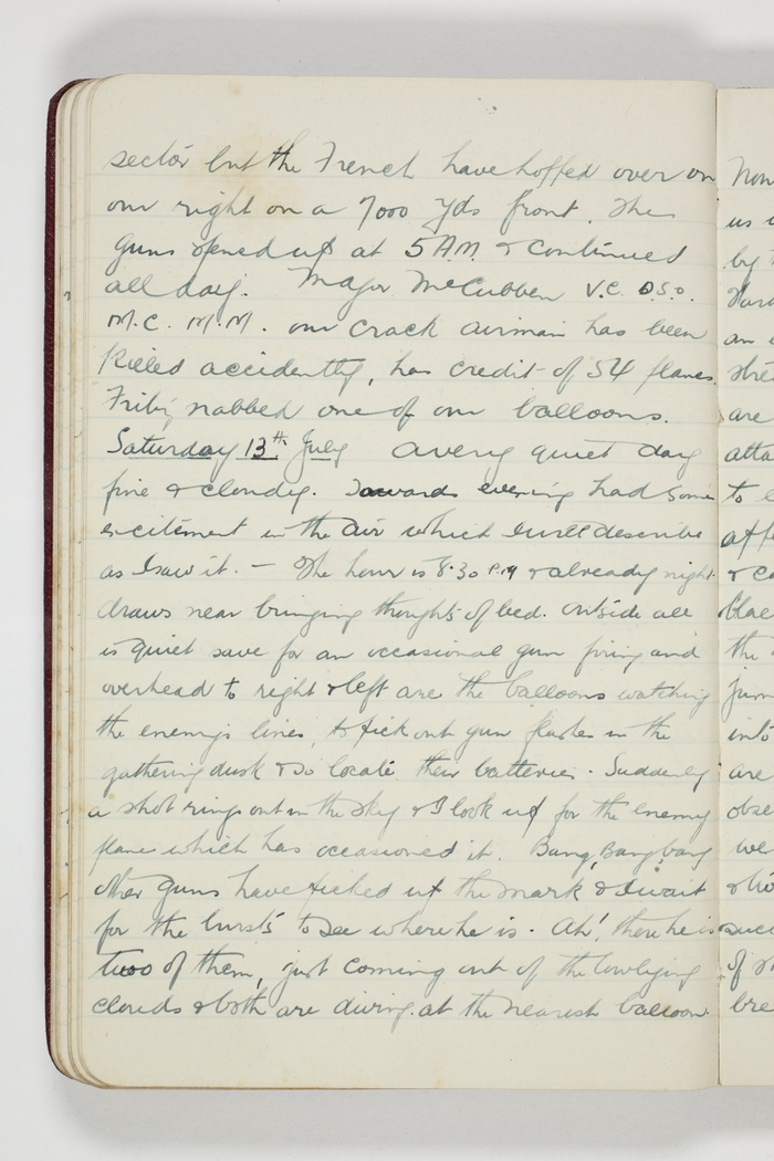 A very quiet day fine & cloudy. Towards evening had some excitement in the air which I will describe as I saw it. - The hour is 8.30 P.M. & already night draws near bringing thoughts of bed. Outside all is quiet save for an occasional gun firing and overhead to right & left are the balloons watching the enemy's lines, to pick out gun flashes in the gathering dusk & so locate their batteries. Suddenly a shot rings out in the sky & I look up for the enemy plane which has occasioned it. Bang, Bang, bang other guns have picked up the mark & I wait for the bursts to see where he is. Ah! There he is two of them, just coming out of the lowering clouds & both are diving at the nearest balloon.
