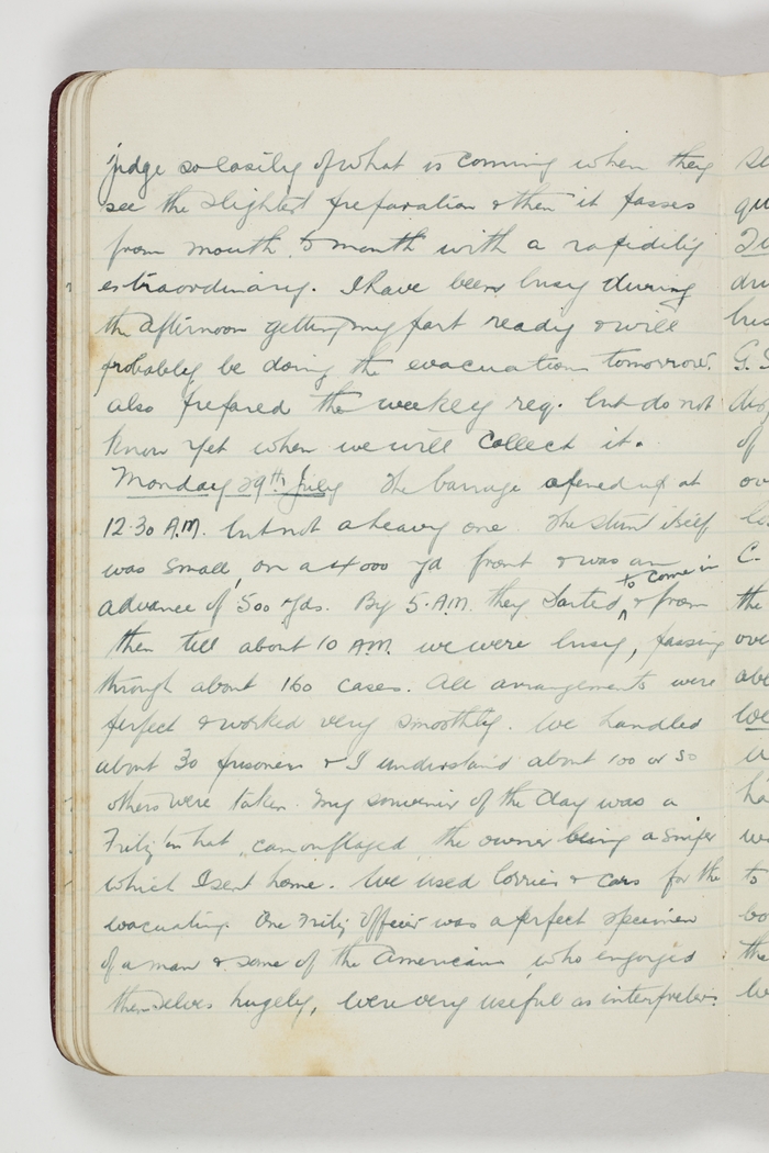 The barrage opened up at 12.30 A.M. but not a heavy one. The stunt itself was small, on a 4000 yd front & was an advance of 500 yds. By 5 A.M. they started to come in from then till about 10 A.M. we were busy, passing through about 160 cases. All arrangements were perfect & worked very smoothly. We handled about 30 prisoners & I understand about 100 or so others were taken. My souvenir of the day was a Fritz tin hat, camouflaged, the owner being a sniper, which I sent home. We used lorries & cars for the evacuating. One Fritz officer was a perfect specimen of a man & some of the Americans, who enjoyed themselves hugely, were very useful as interpreters