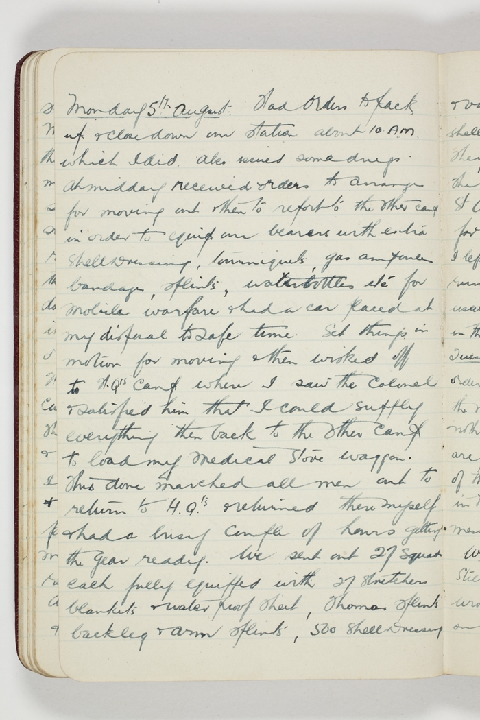 Had orders to pack up & close down our station about 10 A.M. which I did. Also issued some drugs. At midday received orders to arrange for moving out & then to report to the other camp in order to equip our bearers with extra shell dressing, tourniquets, gas ampoules, bandages, splints, waterbottles etc for mobile warfare & had a car placed at my disposal to save time. Set things in motion for moving & then wisked off to H.Qs Camp where I saw the Colonel & satisfied him that I could supply everything then back to the other camp to load my medical store waggon.
