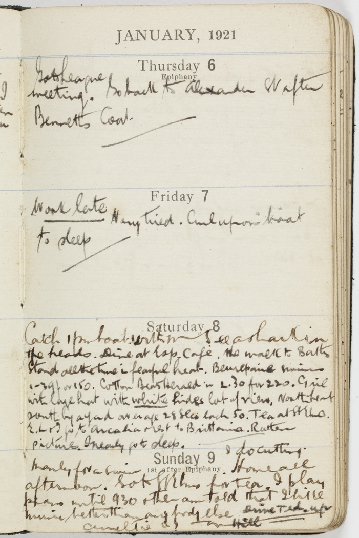 Catch 1pm boat with M. See a shark in the heads. Dine at Esp. Café. We walk to Baths Stand all the time in fearful heat. Beurepaire swims 1-39 for 150. Cotton Beats Herald in 2.30 fo 220. Girl with large hat with white hides lot of view. North beat South by a yard average 28 secs each 50. Tea at St Elmo. E.L. & I go to Arcadia & rest to Brittania. Rotten pictures. I nearly go to sleep.