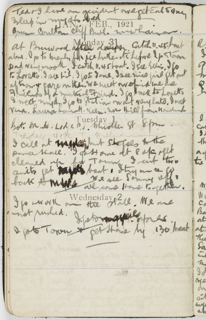 At Burwood after dinner Catch 11.15 boat alone. I go to Manly for ice butter etc before I go to town. Dad very crook. I catch 11.45 boat. I see Ellis. I go to Loretto. I see Lil. I see nice girl get out of tram & gaze on then. We meet & we find we are Friends of a mutual friend. I go back to Lovetts I meet Myd. I go to Station & wait very late. I meet Vera. Laura Larratt. Keen, Mrs Hill from Homebush