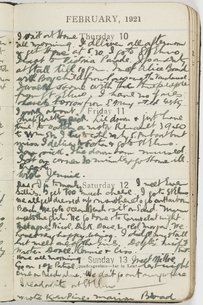 I work about shop. Pretty sick. Lil down & just home time to catch a motor Renault 3940 to Wm St. I try to catch M by 5.pm boat but miss I deliver Mr Foster & go to St Elmo. I am sick, I lie down & am nursed. I sit on corner 30 minues & go Home ill. and go to