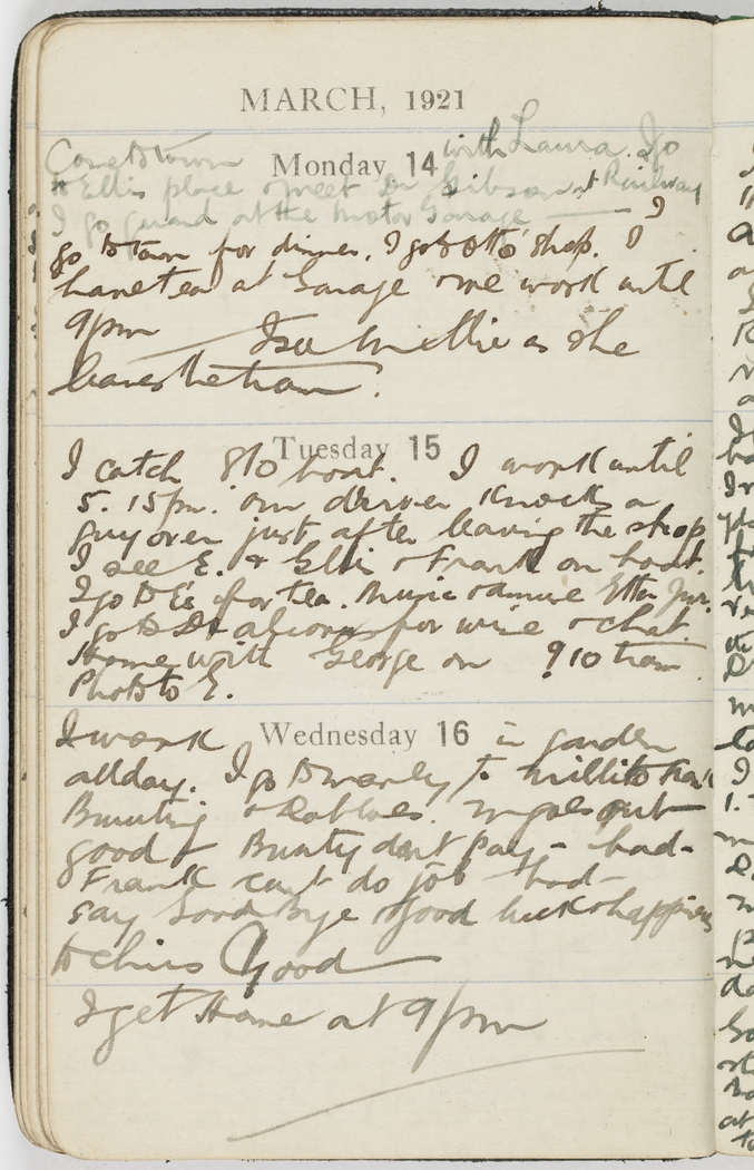 Come to town with Laura. I go to Ellis place & meet Dr Gibson at Railway I go guard at Motor Garage------ I go to town for dinner. I go to Otto' shop. I have tea at Garage & we work until 9 pm. I see Millie as she leaves the tram.