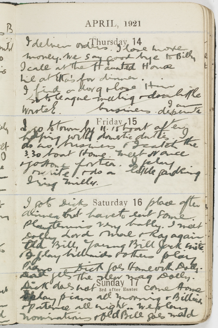 I deliver orders. I lose more money. We say goodbye to Billy. I call at the Haunted House Lil at Etta's for dinner. I find a [indecipherable] & lose him. Go to League meeting & do a little business. I am desperate.