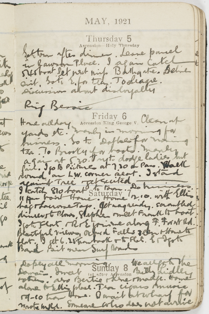 Go to town after dinner. Leave parcel in Rawson Place, I again catch 5.45 boat. Sit next Miss Bathgate. Deliver suit. Go to E for tea. To League. Discussions about disloyalty. Ring Bernie