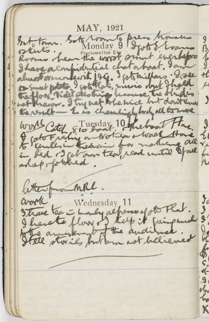 Go to town. Go to press trousers & skirts. I go to E. Evans Rooms & hear the worst smut ever before so I have a confidential chat on boat. I am almost overcome with J & G. I go to Millars. I see sweet potato, I got to flats, music but I hold the floor. Violet sees things because the blind is not drawn. I try not to be nice but don't know the result - E is charmingly lovely all the more