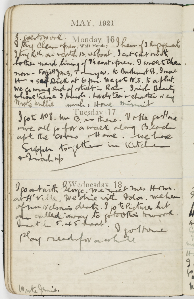 E. goes to work. I try clean & press I hear of 3 engagements. I try R.K. on & catch 12.45 boat. I cut suit & with bother mend lining of V's coat & press. I walk to Channon - Foggitt Jones, Tommy W. to Bathurst St. I meet H & see Dick at 6pm. We go to N.S. to a flat. We go wrong end of street in rain. Irish Beauty whose tresses I brush. Lovely tea & chatter very much. Home