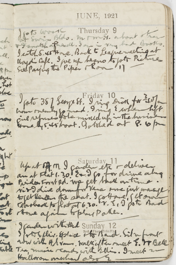 I go to 387 George St. I ring Dick for 3/4 of an hour & nearly go mad. I ring E when lift girl refuses to be mixed up in the business. Home by 5.45 boat. I go to bed at 8.10pm.