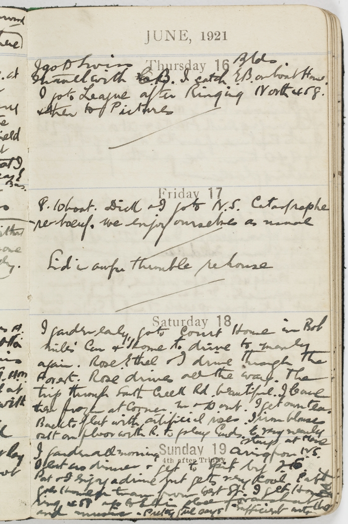 I travel with M.B. I catch E.B. on boat home.I go to League after Ringing North 458. and then to Pictures
