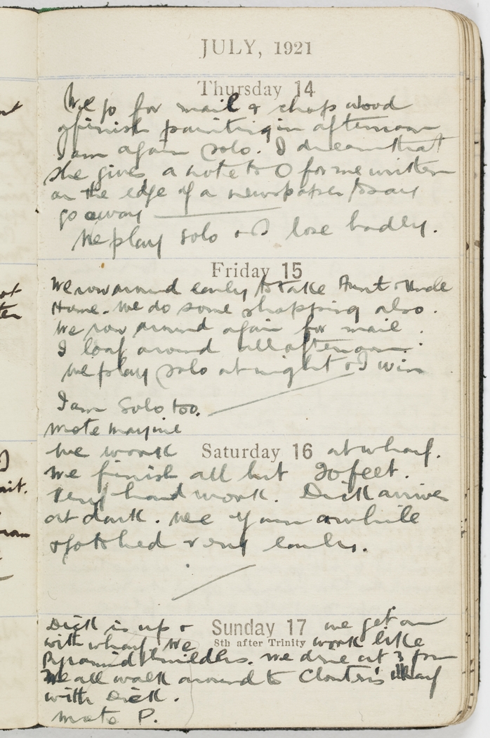 We go for mail and chop wood and finish painting in afternoon I am again solo. I dream that she gives a note to O for me written on the edge of a newspaper to say go away ----------  We play solo and I lose badly.