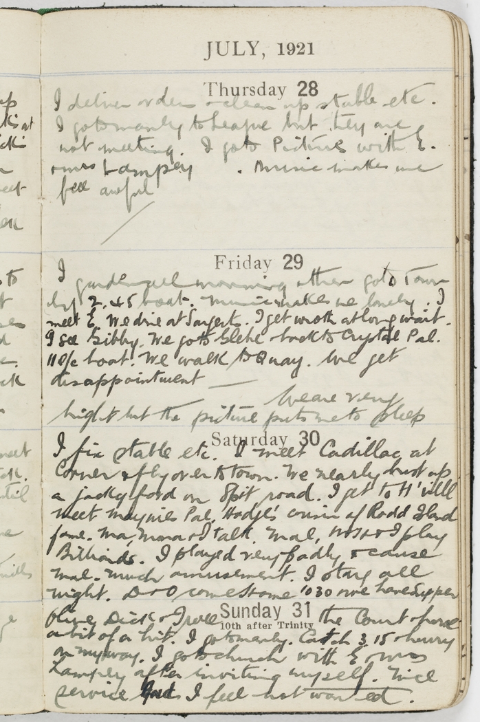 I fix stable etc. I meet Cadillac at Corner and fly over to town. We nearly bust up a jacky ford on Spit road. I get to H'ville meet maynies Pal. Hodges' cousin of Rodd Island fame. Ma, Mona and I talk. Wal, W H and I play billiards. I played very badly and cause Wal much amusement. I stay all night. D & O come home 1030 & we have supper.
