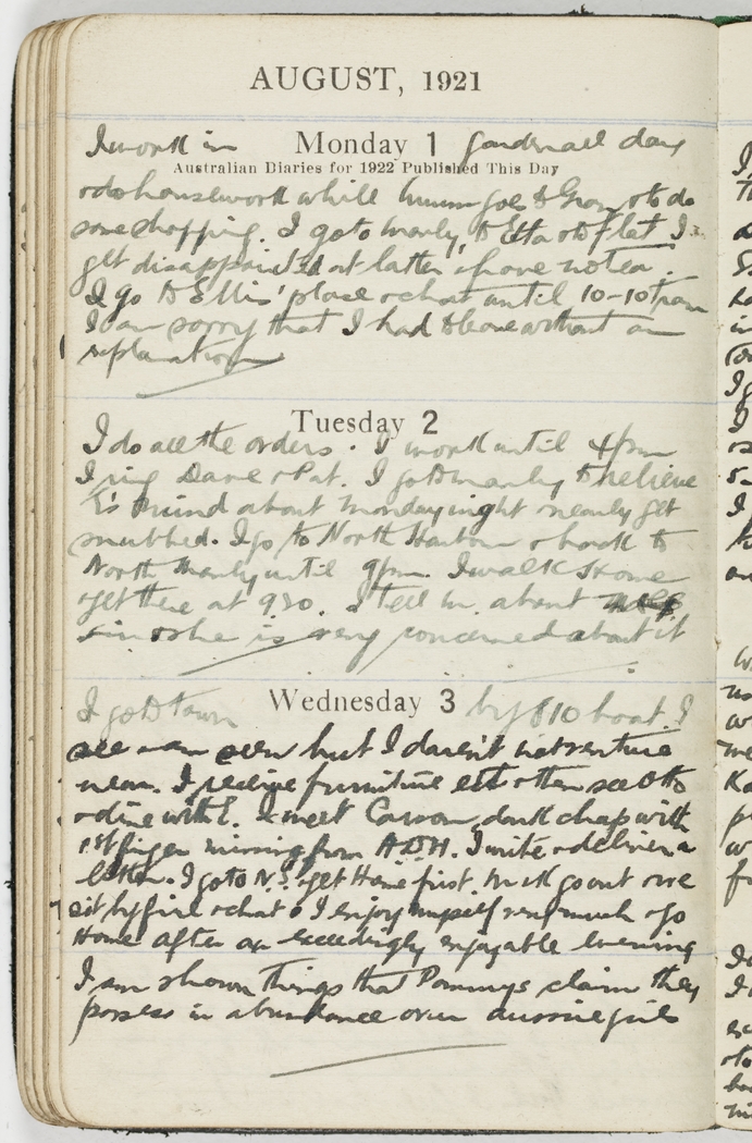I go to town by 8.10 boat. I see and are seen but I daren't not venture near. I receive furniture etc & then see Otto & dine with E. I meet Carson dark chap with 1st finger missing from A.D.H. I write and deliver a letter. I go to N.S. and get home first. M & K go out & we sit by fire & chat. I enjoy myself very much & go home after an exceedingly enjoyable evening. I am shown things the Pommys claim they possess in abundance over Aussie girls