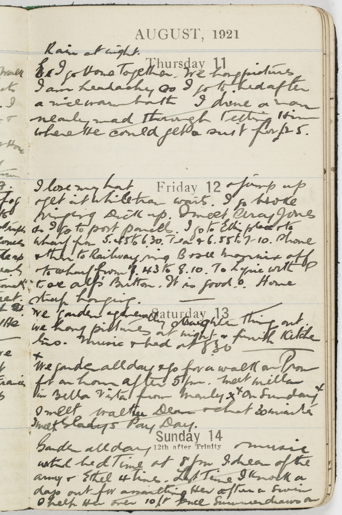 I lost my hat & jump up to get it while tram waits. I go broke ringing Dick up. I meet Percy Jones as I go to post parcels. I go to Ellis place & to wharf for 5.45 to 6.30 Tea and 6.55 to 7.10. Phone and then to Railway, ring B & see Mannix off & to wharf from 7.43 to 8.10. To Lyric with P to see Alf's Britton. It is good .o. Home strap hanging.