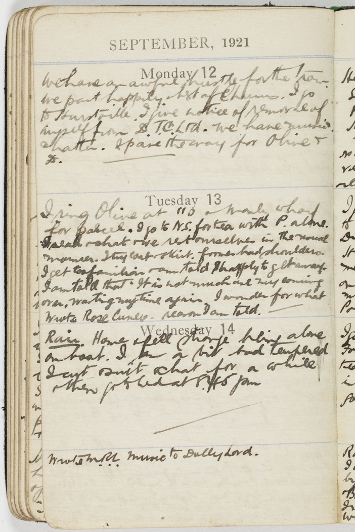 I ring Olive at 110 & Manly wharf for parcel. I go to N.S. for tea with P. alone. I read & chat & we rest ourselves in the usual manner. I try coat & skirt. forms bad shoulders. I get too familiar & am told sharply to get away. I am told that It is not much use my coming over, wasting my time again. I wonder for what reason I am told.