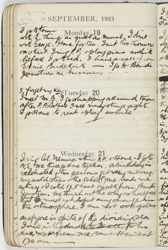 I ring Col.Munro & then P.P. & Home. I go to N.S. We three go Home together. A Birthday is celebrated & two persons get very merry. My watch stops & the Sober (?) one leads me astray & I catch 12.5 boat & walk from Bondi Junction. We thrash out the why & wherefore that I must not expect any change in the atmosphere. I am not so hopeless as at yore in spite of the dividing sea I am introduced to Nell who does not hear me & come Home at 1.30 am ----