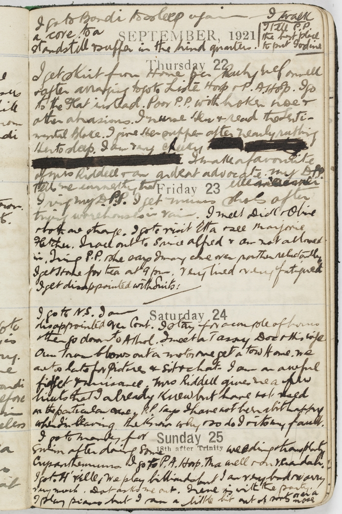 I get skirt from Home per Ruby O'Connell & after arranging to go to Lister Hosp And P.A. Hosp. I go to the Kat instead. Poor P.P. with broken nose & other abrasions. I nurse her & read the Sentimental Bloke. I give her supper after nearly soothing her to sleep. I am very cheeky I make a favourite of Mrs Riddell & an ardent advocate. My D.P.P. tells me earnestly that [indecipherable].