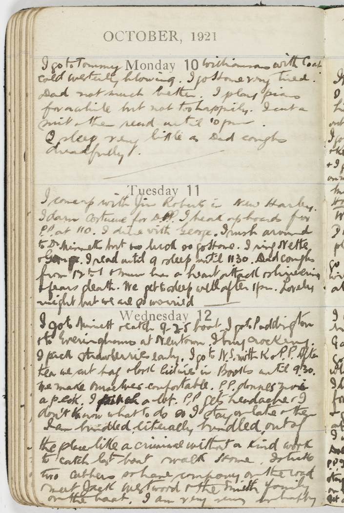 I go to Tommy Williams with coat. cold westerly blowing. I go home very tired. Dad not much better. I play piano for a while but not too happily. I cut a suit and then read until 10 pm. I sleep very little as Dad coughs dreadfully.