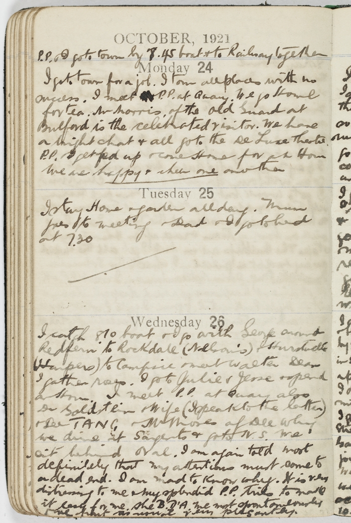 I catch 8.10 boat & I go with George around Redfern to Rockdale (Nelson's) & Hurstville (Harpers) to Campsie & meet Walter Dean I gather roses. I go to Julie & Jesse & spend an hour. I meet P.P. at Quay also Dr Goldstein & wife (I speak to the latter) & Dr Tang & Mr Moses of Dee Why we dine at Sargents & go to IV.S. We sit behind oval. I am again told most definitely that my attentions must come to a dead end. I am mad to know why. It is very distressing to me & my splendid P.P. tries to make it easy for me. She B.D'A. me most spontaneously & we part as usual very pleasantly.