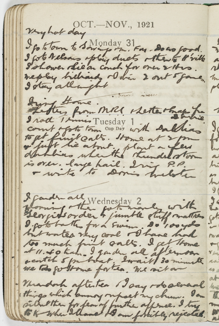 I garden all morning & then go to Manly with Georges order & jumble stuff & mattress I go to baths for a swim. Do 100 yds but water very cool & I have had too much fruit salts. I get home at 11.40 tram. I garden all afternoon & catch 5 pm boat. I wait 30 minutes we two go home for tea. We sit on verandah after tea & I say & do several things which annoy & upset my chum. I am silent then for fear of further offence. I try to K --- when I leave & I am forcibly rejected.