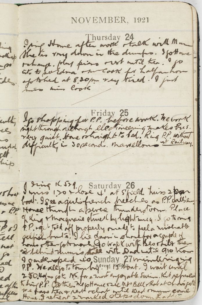 I ring K.529. I miss 1.20 & lose 4' at S'fields miss 2 pm boat. I see a girl's french breeches as P.P. calls 'em. Home through a severe thunderstorm. Place corner King & Macquarie struck by lightning. I go to ring P.P. & get told off properly & made to feel a miserable selfish brute. I lie down in shame for a couple of hours & then go to Manly.