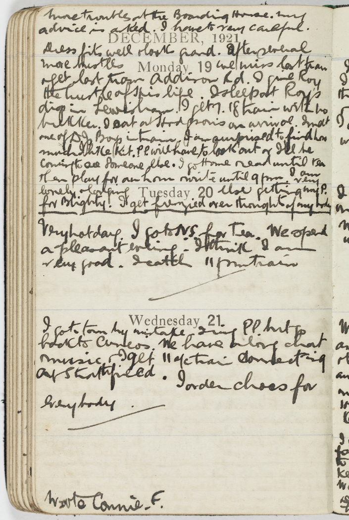 More trouble at the boarding house. My advice is asked. I have to be very careful. Dress fits well & looks grand. After several more hustles we miss last train & get last tram Addison Rd. I give Roy the hustle of his life. I sleep at Roy's digs in Lewisham. I get 7.18 train with no brekker. I eat at Hodgson's on arrival. I meet one of D.Js Boys in train. I am surprised to find how much I like Kit. P.P. will have to look out or I'll be coming to see someone else. I go home & read until tea then play for an hour & write until 9 pm, I am very lonely & longing [else ]getting my P. for Blighty. I get frenzied over thoughts of my body