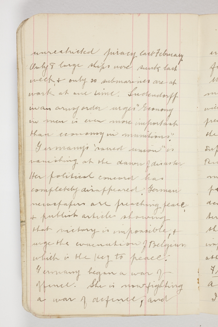 unrestricted piracy last February. Only 8 large ships were sunk last week, & only 20 submarines are at work at one time. Ludendorff in an army order urges "Economy in men is even more important than economy in munitions". Germany's "sacred union" is vanishing at the dawn of disaster. Her political concord has completely disappeared. German newspapers are preaching peace, & publish articles showing that victory is impossible, & urge the evacuation of Belgium which is the key to peace. Germany began a war of offence. She is now fighting a war of defence, and every day she becomes more fearful that she may be beaten. Military defeat would kill militarism. The rulers of Germany will move Heaven & earth to prevent their own destruction. With the prospect of commercial supremacy in a disorganised Russia it is possible Germany may be willing to offer a large proportion of what the Allies demand. No peace, whatever its terms, can have any value unless those terms ensure the impossibility of another German attempt to wreck the world.