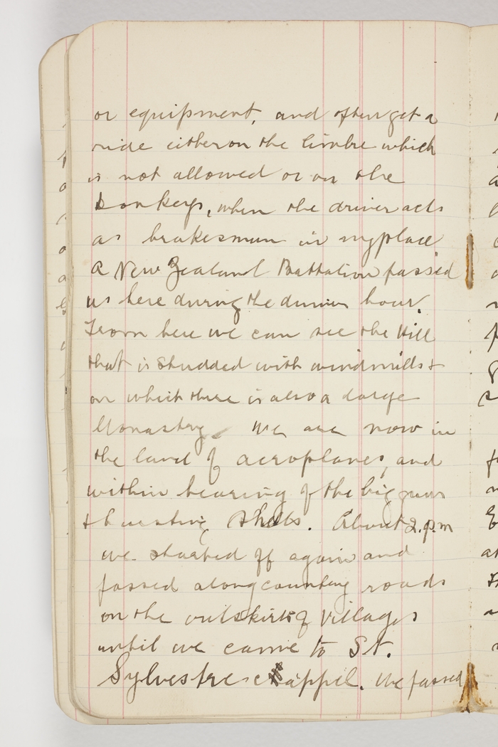 or equipment, and often get a ride either on the limbre which is not allowed or on the Donkeys, when the driver acts as brakesman in my place. A New Zealand Battalion passed us here during the dinner hour. From here we can see the hill that is studded with windmills & on which there is also a large Monastry. We are now in the land of aeroplanes, and within hearing of the big guns & bursting shells. About 2.p.m we started off again and passed along country roads on the outskirts of villages until we came to St. Sylvestre-cappel. We passed through it, and it is rather a pretty little town, with a magnificent brick church large enough to be called a cathedral in Victoria, and we halted at 4.p.m. for the night in a fine grass paddock, and the mules & horses got a splendid feed of green suculent grass.