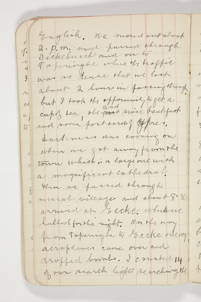 English. We moved out about 2. p.m. and passed through Dickebusch and on to Poperinghe where the traffic was so dense that we took about 2 hours in passing through, but I took the opportunity to get a cup of tea, the 2nd since breakfast and some post cards of Ypres.
