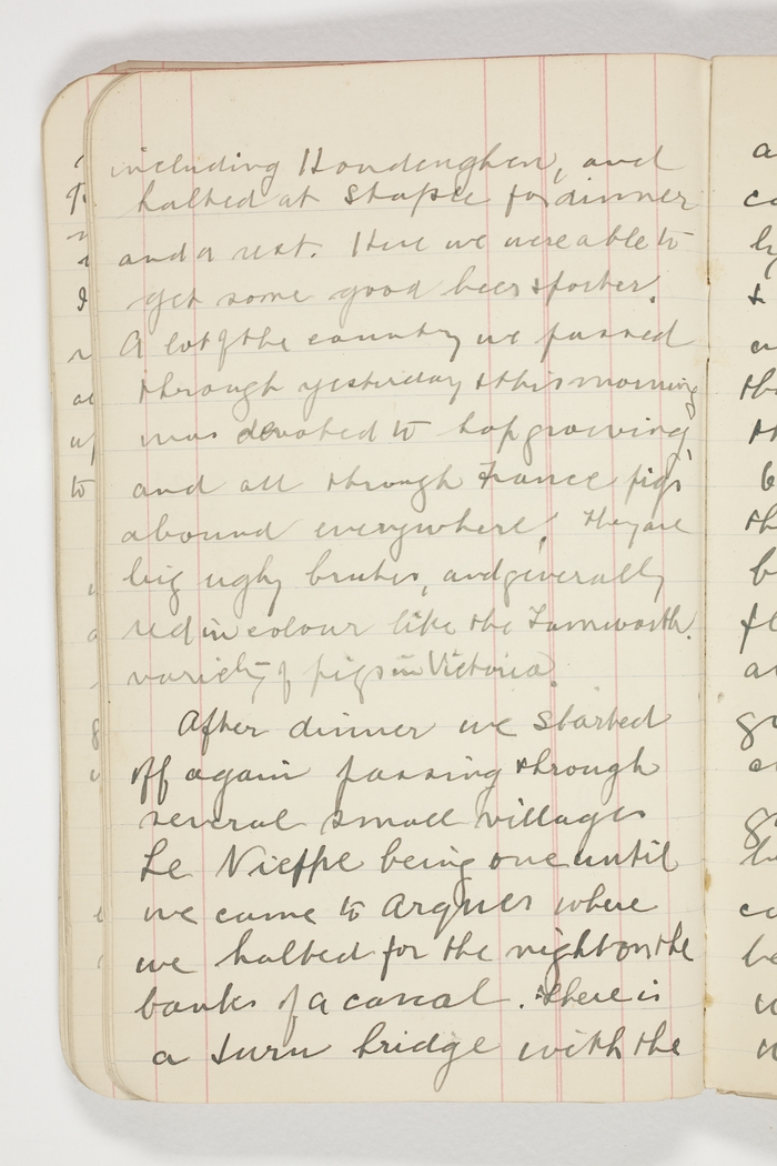 A lot of the country we passed through yesterday & this morning was devoted to hop growing, and all through France pigs abound everywhere. They are big ugly brutes, and generally red in colour like the Tamworth variety of pigs in Victoria.