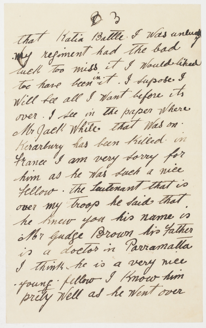 that Katia Battle. I was unlucky, my regiment had the bad luck too miss it, I would liked too have been in it. I supose I will see all I want before its over. I see in the paper where Mr Jack White that was on Kerarbury has been killed in France. I am very sorry for him as he was such a nice fellow. The Leutenant that is over my troop he said that he knew you, his name is Mr Gudge Brown, his Father is a doctor in Parramatta. I think he is a very nice young fellow, I know him pretty well as he went over
