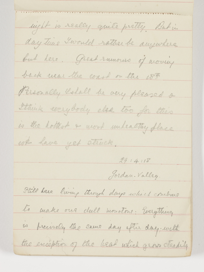 night is really quite pretty. But in day time I would rather be anywhere but here. Great rumours of moving back near the coast on the 18th, Personally I shall be very pleased & I think everybody else too for this is the hottest & most unhealthy place we have yet struck.