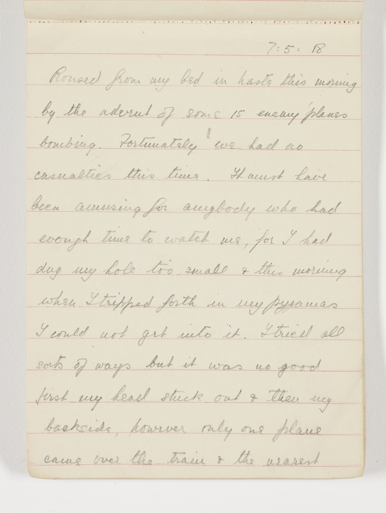 Roused from my bed in haste this morning by the advent of some 15 enemy planes bombing. Fortunately we had no casualties this time. It must have been amusing for anybody who had enough time to watch us, for I had dug my hole too small & this morning when I tripped forth in my pyjamas, I could not get into it. I tried all sorts of ways but it was no good first my head stuck out & then my backside, however only one plane came over the train & the nearest