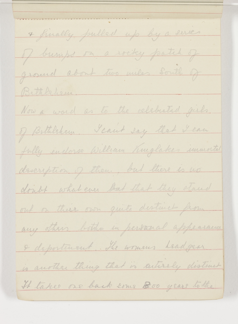 Now a word as to the celebrated girls of Bethlehem. I can't say that I can fully endorse William Kinglakes immortal description of them, but there is no doubt whatever but that they stand out on their own quite distinct from any others both in personal appearance & deportment. The womens headgear is another thing that is entirely distinct. It takes one back some 800 years to the