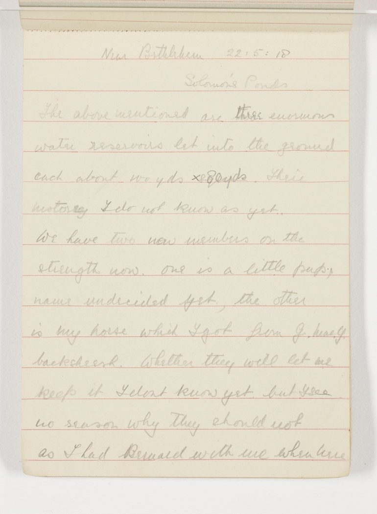 We have two new members on the strength now. One is a little pup, name undecided yet, the other is my horse which I got from J. [indecipherable].. backsheesh. Whether they will let me keep it I dont know yet but I see no reason why they should not as I had Bernard with me when here