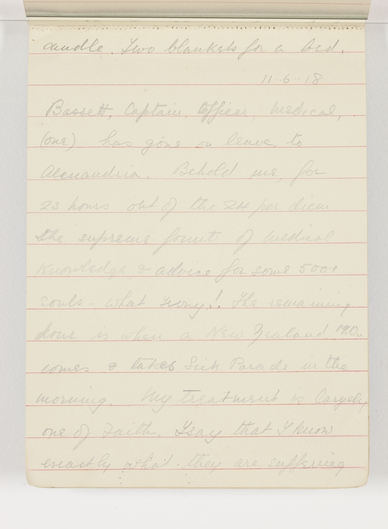 Basset, Captain, Officer, Medical, (our) has gone on leave to Alexandria. Behold me, for 23 hours out of 24 per diem the supreme fount of medical knowledge & advice for some 500+ souls - what irony! The remaining hour is when a New Zealand MO. comes & takes Sick Parade in the morning. My treatment is largely one of faith. I say that I know exactly what they are suffering