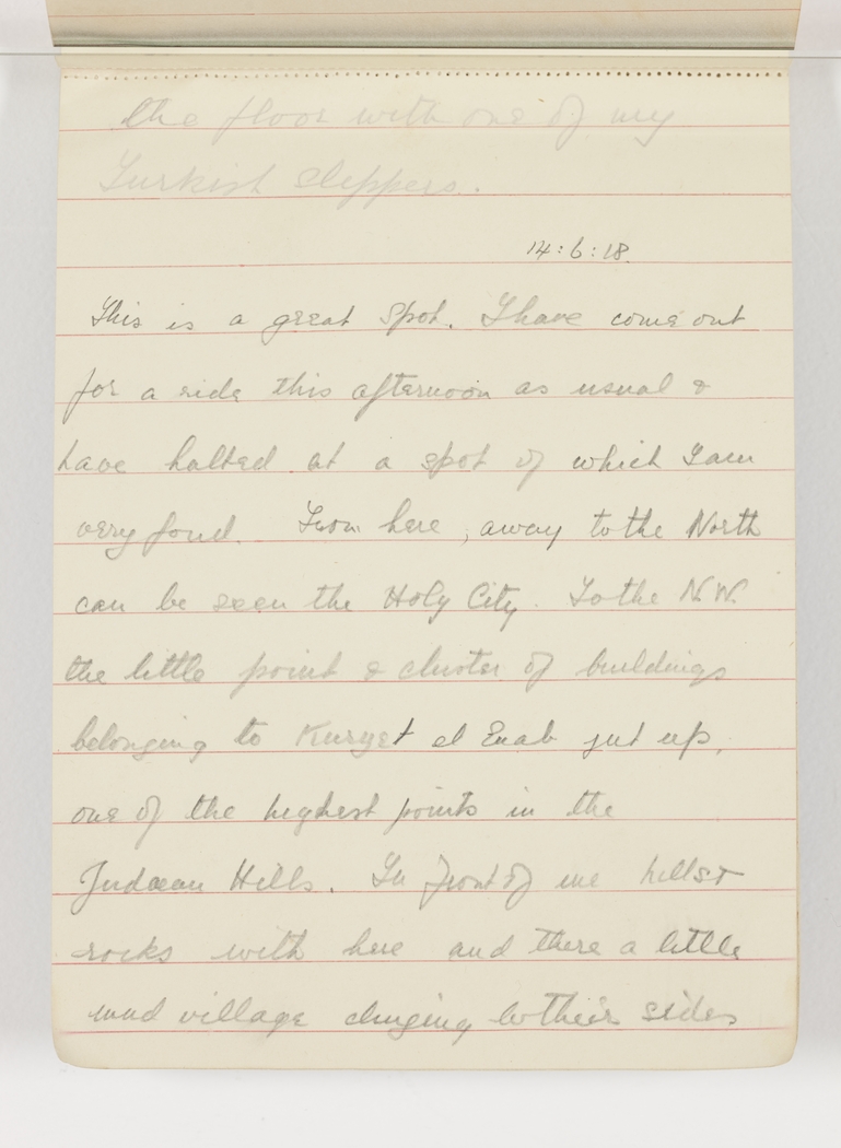 This is a great spot. I have come out for a ride this afternoon as usual & have halted at a spot of which I am very fond. From here, away to the North can be seen the Holy city. To the N.W. the little point & cluster of buildings belonging to Kuryet el Enab jut up, one of the highest points in the Judaean Hills. In front of me hills & rocks with here and there a little mud village clinging to their sides