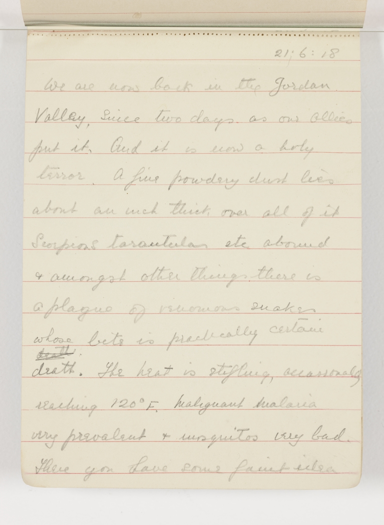 We are now back in the Jordan Valley. Since two days as our Allies put it. And it is now a holy terror. A fine powdery dust lies about an inch thick over all of it Scorpions tarantulas etc abound & amongst other things, there is a plague of venomous snakes whose bite is practically certain death. The heat is stifling, occassonally reaching 120° F. Malignant Malaria very prevalent & mosquitos very bad. There you have some faint idea