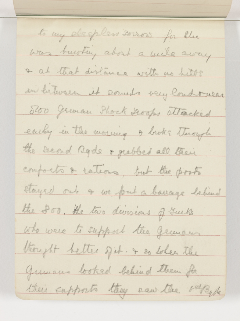 to my sleepless sorrow for she was bursting about a mile away & at that distance with no hills in between it sounds very loud & near. 800 German Shock Troops attacked early in the morning & broke through the Second Bgde & grabbed all their comforts & rations, but the posts stayed out & we put a barrage behind the 800. The two divisions of Turks who were to support the Germans thought better of it & so when the Germans looked behind them for their supports they saw the 1st Bgde