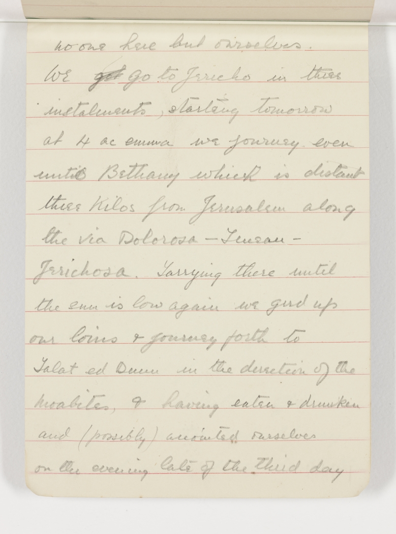 We go to Jericho in three instalments, starting tomorrow at 4 ac emma we journey even unto Bethany which is distant three Kilos from Jerusalem along the via Doloroso – Tensan – Jerichosa. Tarrying there until the sun is low again we gird up our loins & journey forth to Talat Ed Durum in the direction of the Moabites, & having eaten & drunken & (possibly) anointed ourselves on evening late of the third day