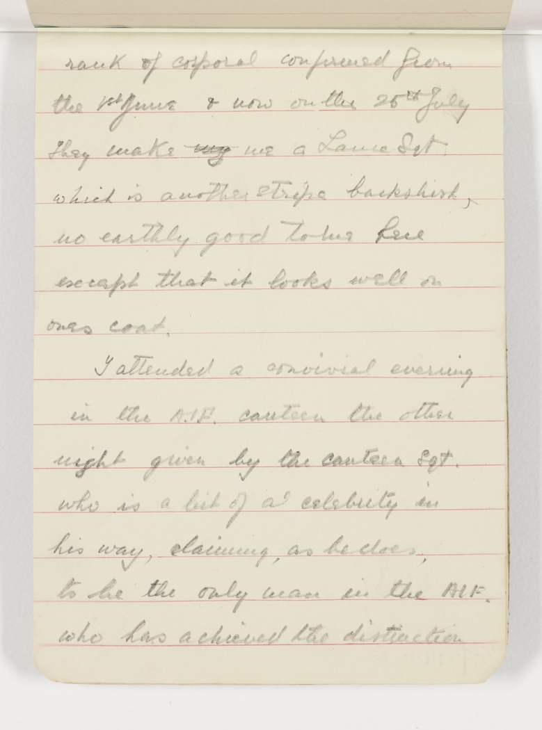 I attended a convivial evening in the A.I.F. canteen the other night given by the canteen Sgt. who is a bit of a celebrity in his way, claiming as he does, to be the only man in the AIF. who has achieved the distinction