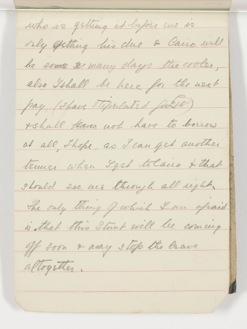 who is getting it before me is only getting his due & Cairo will be many days the cooler, also I shall be here for the next pay, (I have stipulated for £ 18) & shall not have to borrow at all, I hope, as I can get another tenner when I get to Cairo & that should see me through all right. The only thing of which I am afraid is that this stunt will be coming off soon & may stop the leave altogether.